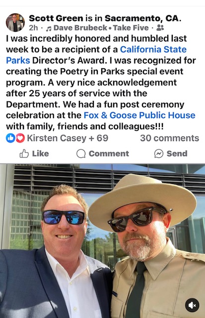 Congratulations to our friend Scott Green! California State Parks awarded Scott the Director’s Award for his creation and leadership of the “Poetry in Parks” events. We are happy to have participated in these the Gatekeepers Museum in Tahoe City, CA with a Tahoe Literary Festival workshop on Beat poets influence on the Dead and other musicians.