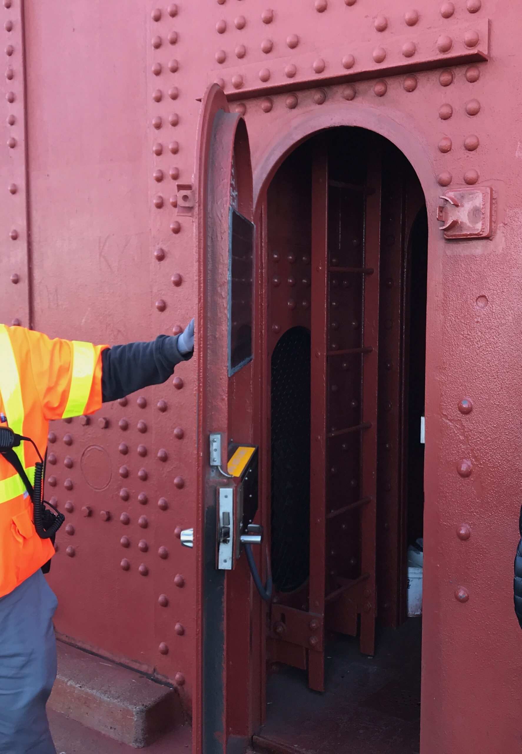 They climbed down the fixed ladder, and steps, to the safety of the catwalk. Relieved, they took a few moments to high five, catch their breath and to enjoy the moment. They scampered the ninety feet across the catwalk and then up to the Bay side Bridge tower crow’s nest flashing beacon.