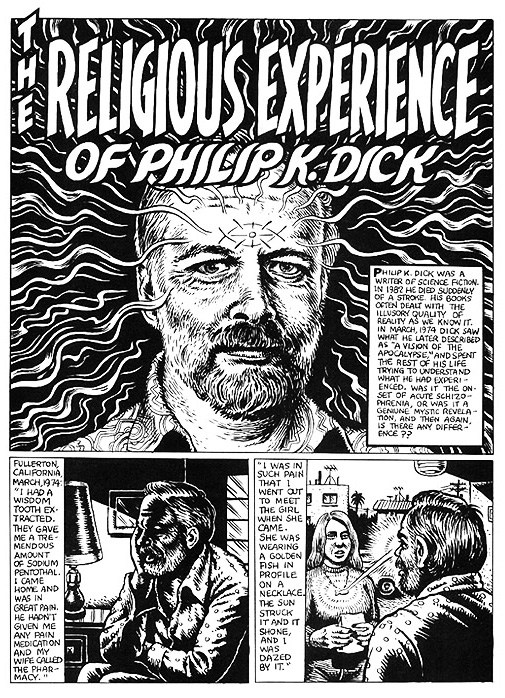 “Crumb, who would later illustrate Bukowski and adapt Sartre in a comic, couldn’t escape the appeal of the literary. In Weirdo #17, published in 1986 and eventually included in the altogether fantastic anthology The Weirdo Years by R. Crumb: 1981–’93 (public library), Crumb illustrated sci-fi legend Philip K. Dick’s now-famous spiritual “exegesis,” his hallucinatory 1974 experience in which he believed to have encountered a God-like presence.” Maria Popova in brainpickings.com